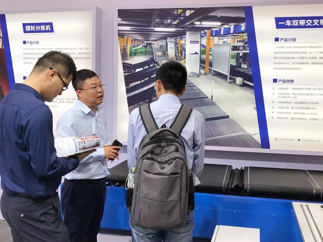 现场展示的两台“大家伙” — 摆轮分拣设备和一车双带交叉带分拣设备吸引了众多参观者前来咨询了解。