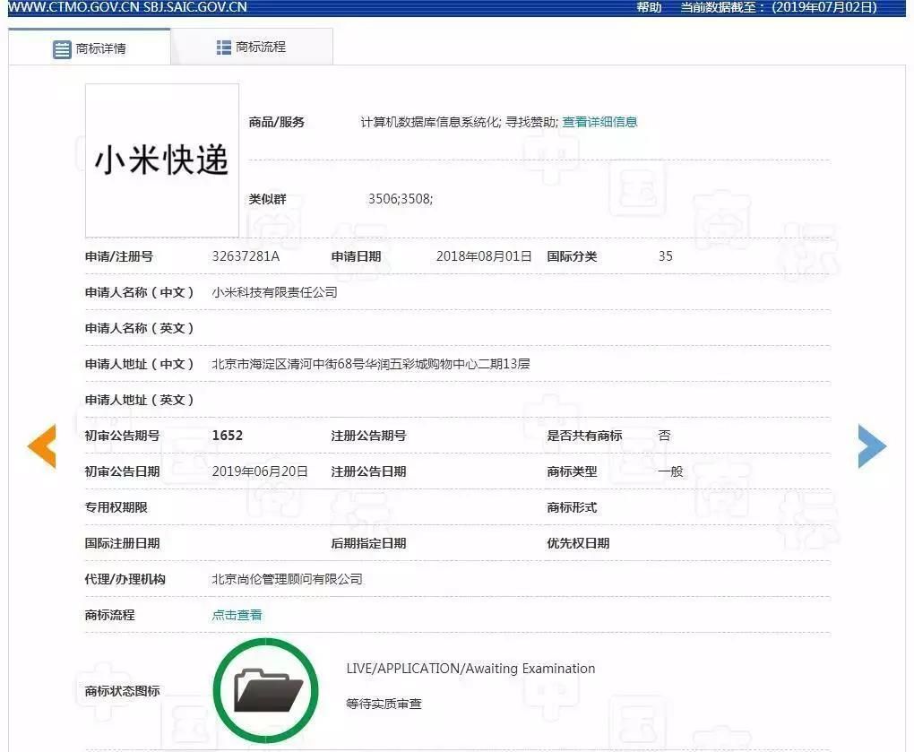 据了解,小米公司于2018年8月1日提交了6件“小米快递”商标申请,注册类别为第35类、第38类、第9类、第42类、第39类。目前,6件商标中第38类与第39类商标已注册成功。
