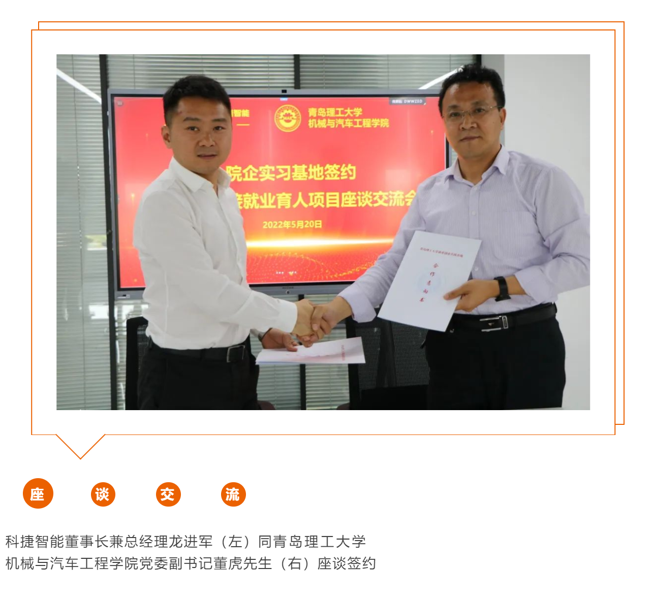 随后,校方领导与公司代表举行了座谈交流,双方就校企合作的项目进行了深入探讨,并在员工实习、暑期社会实践、课题及活动冠名、联合授课等多个项目深入交换了意见,最后双方代表签署《青岛理工大学就业创业实践基地意向协议》并获授牌“青岛理工大学就业创业实践基地”。