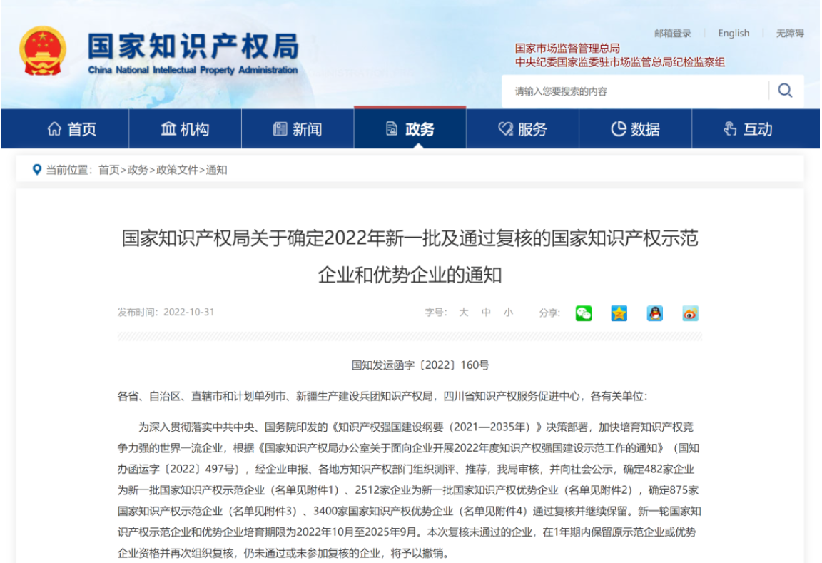 近日,国家知识产权局官网公布了《国家知识产权局关于确定2022年新一批及通过复核的国家知识产权示范企业和优势企业的通知》。公示名单显示,好博智能科技股份有限公司获评“2022年度国家知识产权优势企业”。
